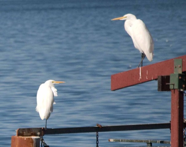 What are these two egrets looking at? Are they watching the open water and the shore at the same time? Why does one bird have one foot up, and the other have both feet down?