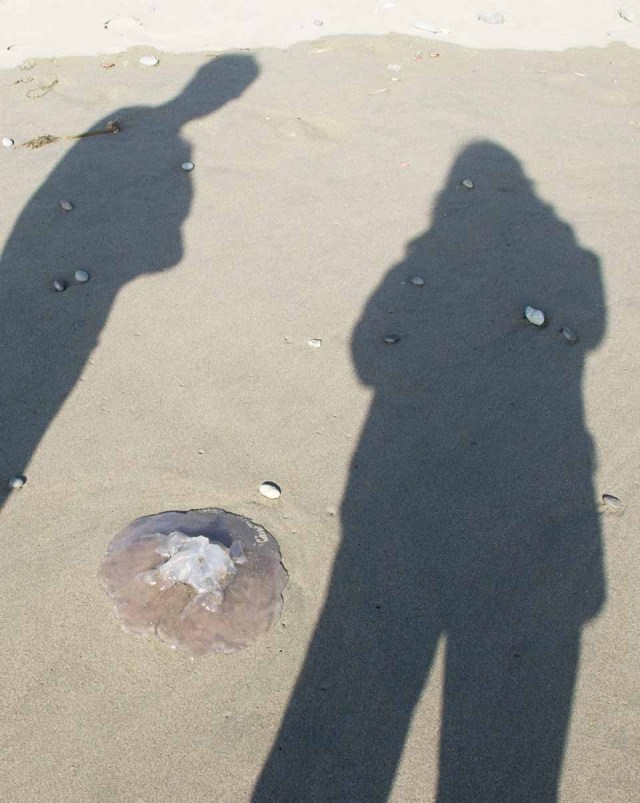 There is something otherworldly and a little creepy about this photo of a jellyfish, at a northern California beach, with human shadows. They belong to my son and me, but don’t we look like paranormal characters? OK, maybe not. Must be the jellyfish.
