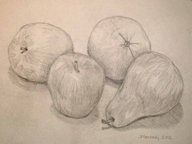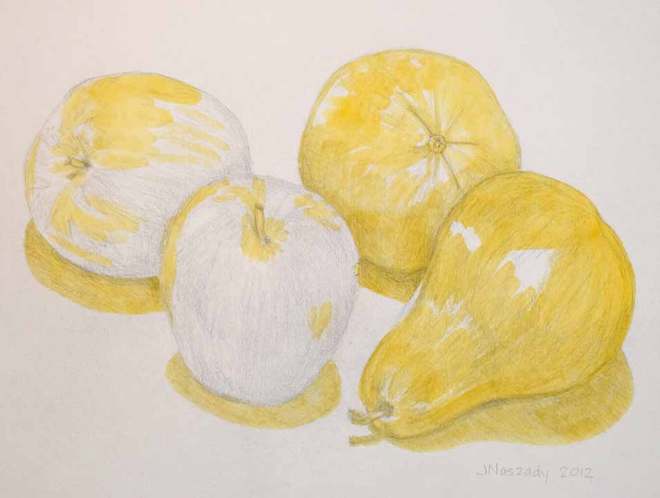 But first, I want to paint some fruit. Step 1: Arrange the fruit and draw it. I attempted to encourage the viewer’s eyes to move across the page in a figure eight. Beginning with the orange, they will move down across the pear from right to left, then to the upright apple, and then the apple on its side. To complete the figure eight , I will place the edge of the table in the lower left corner, hoping that the viewer will glance that way next, and then back to the center. We’ll see.