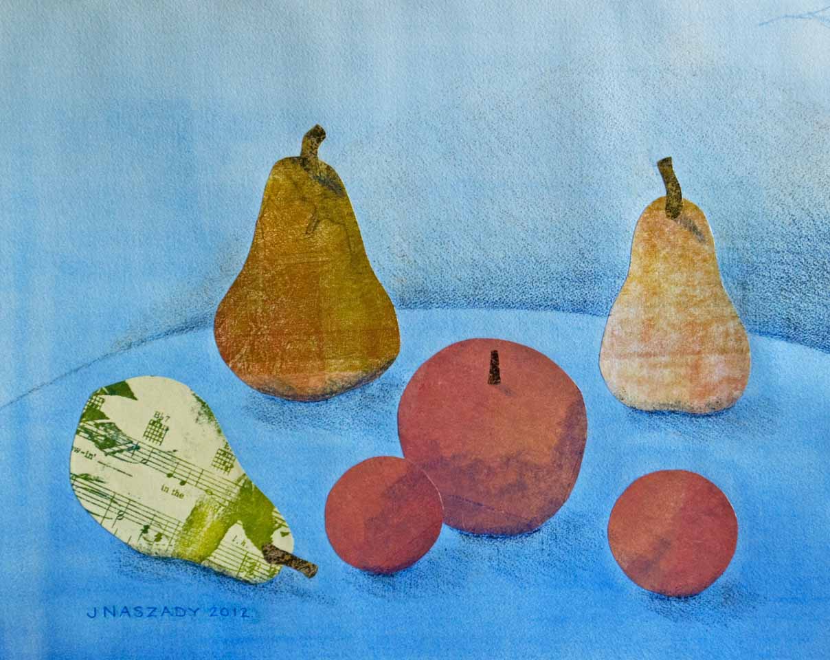 It turns out that my Prismacolor pencils were just what I needed to put the finishing touches on my watercolor collage. I used goldenrod and violet-blue. This mixed-media still life includes cut-out scraps from printmaking projects, a watercolor background, clear acrylic medium used as adhesive, and Prismacolor pencil for shadows.