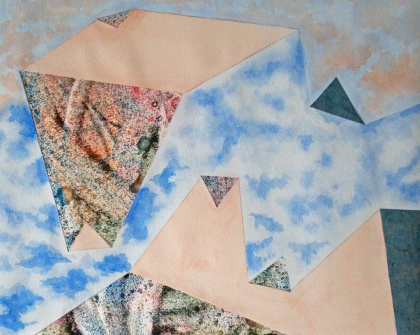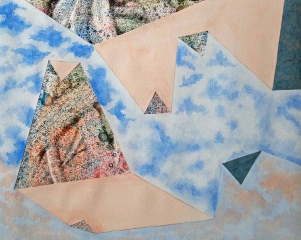 I pulled out some papers I had saved from printmaking, and found colors that would jump out at the viewer. The blue-green section was created by adding a piece of semi-transparent, hand-made light blue paper. The multicolored sections are from pieces created by printing off of a plate with leftover ink that I dragged a knife through and sprayed water onto. The streaks and bubbles go with my cloud theme.
