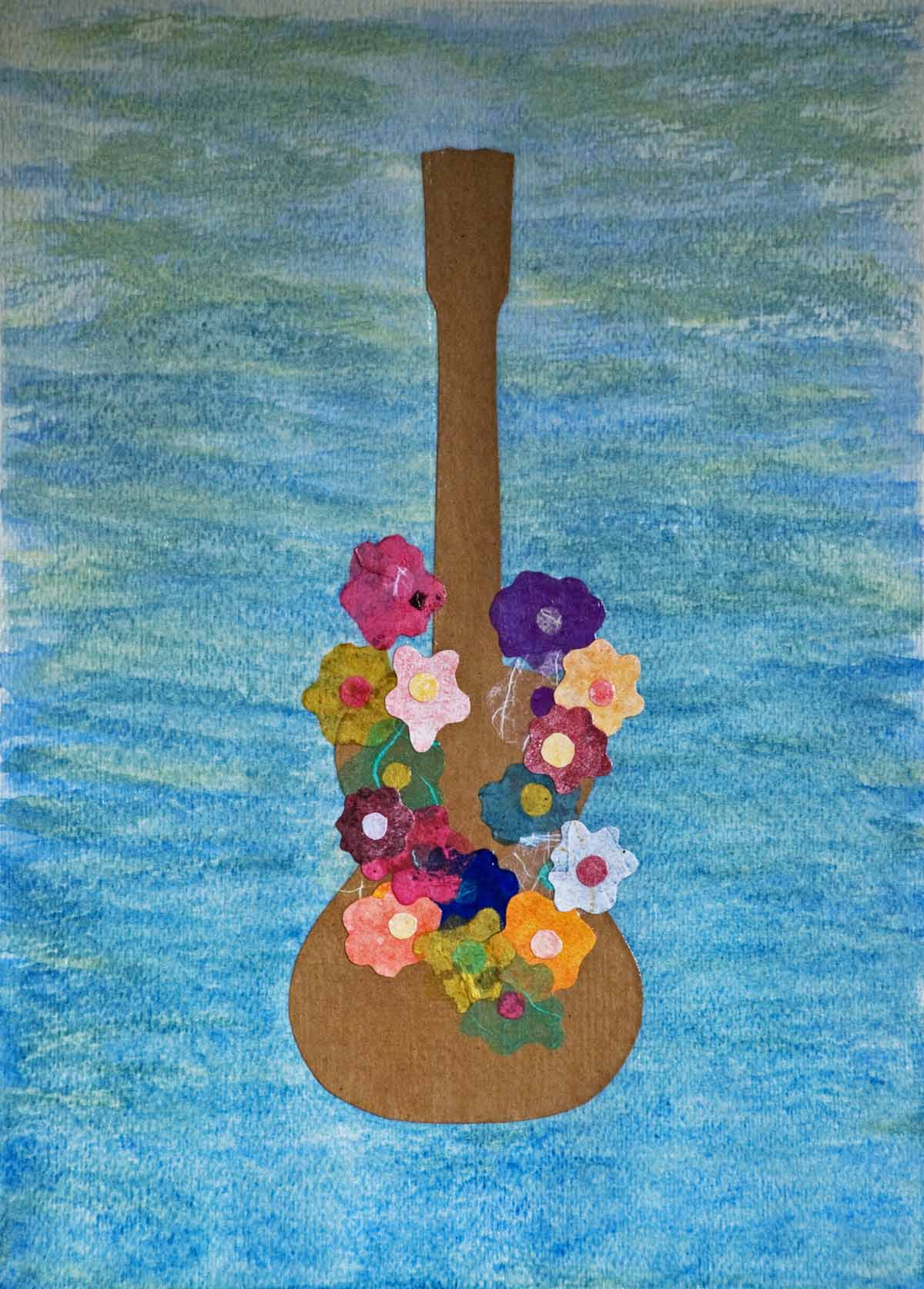 I began with a watercolor background which suggested the ocean, making two of these so that I could decide which one worked best. Then I cut out the silhouette of a ukulele, which figures prominently in my story, from a brown paper bag (one of my favorite art materials). This was attached to the background with clear acrylic medium. Flowers cut out of handmade papers and other printmaking leftovers create a Hawaiian lei. What says ukulele more decidedly than a Hawaiian lei?