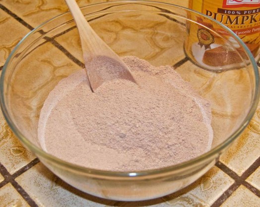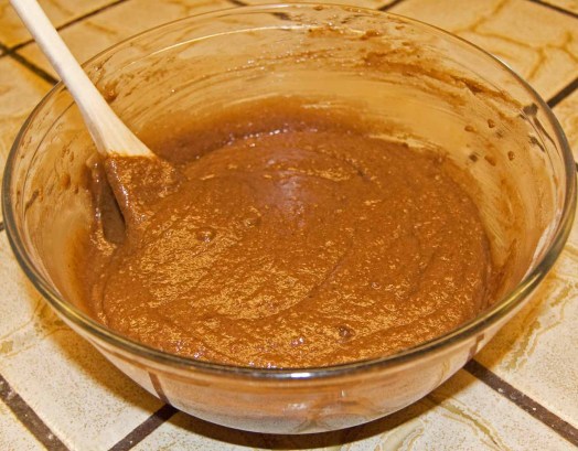 Preheat the oven to 350 degrees F. Mix together 3/4 cup unbleached wheat flour, 3/4 cup whole wheat flour, 3/4 cup sugar, 1/2 cup sweet ground chocolate and cocoa, 1 teaspoon baking soda, and 1/4 teaspoon each of cinnamon, allspice, nutmeg, and ginger.