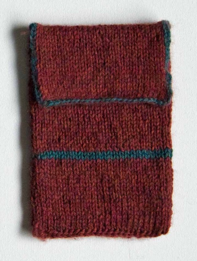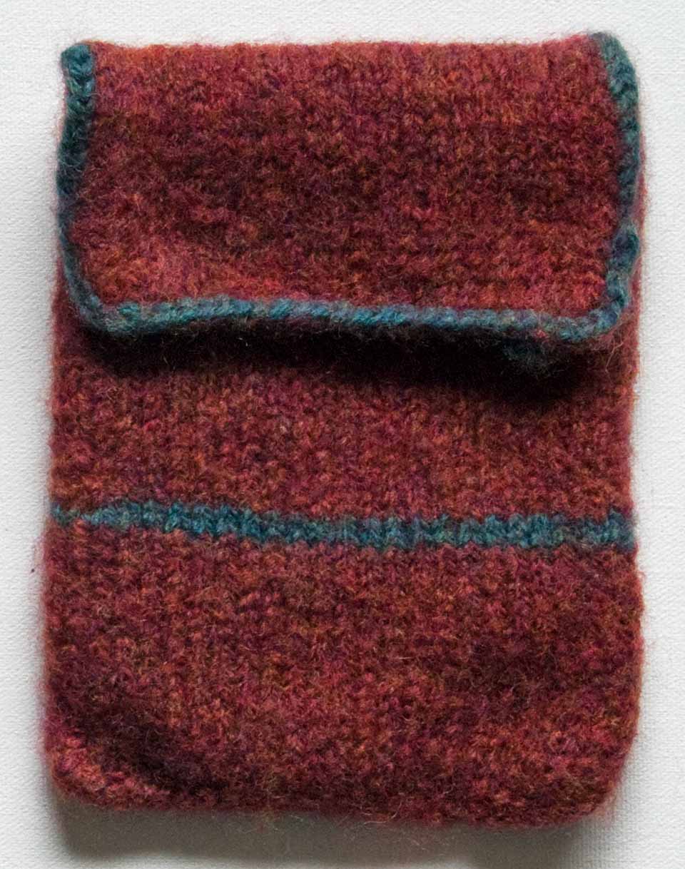 My experiments with felted hats and scarves during the last couple of years yielded mixed results. This time I chose something small to play with. I was originally going to make an oblong clutch-type purse. Then I decided to use a circular needle, and it ended up being a pouch. My Kindle fit perfectly before I shrank it to felt it, and now it is too small for that, but definitely large enough for other “stuff.” It is awaiting a trip to the store for hook and loop fastener.
