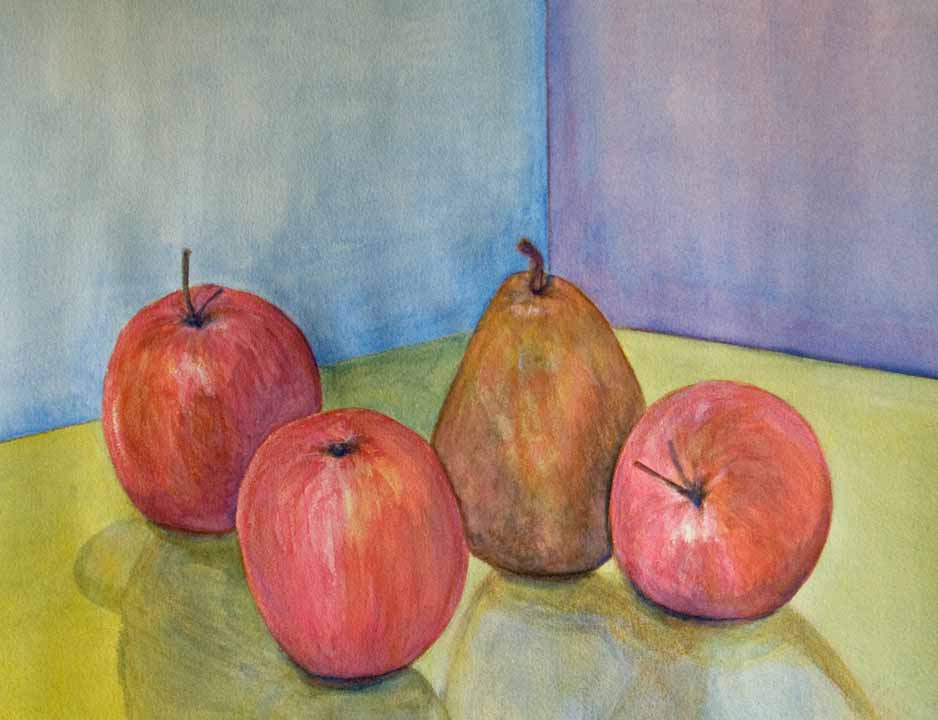 Here is my final version of Three Apples and a Pear. I have cropped it in Photoshop, which helps me to define the composition, and now all I need to do is mat and frame the watercolor painting itself. I am finished with all of my still life of fruit projects, and so I will concentrate on my flowers.