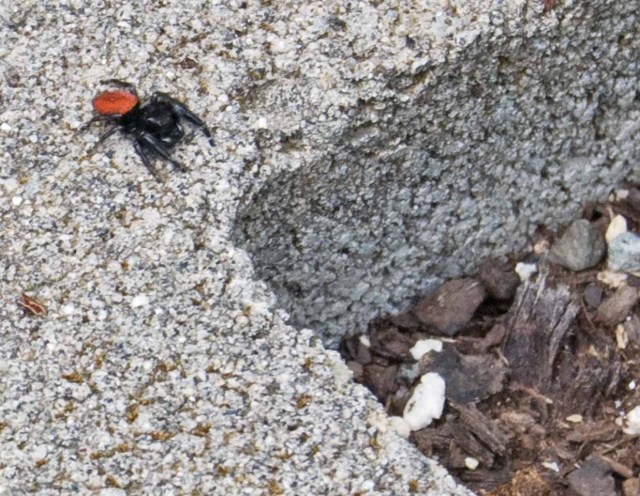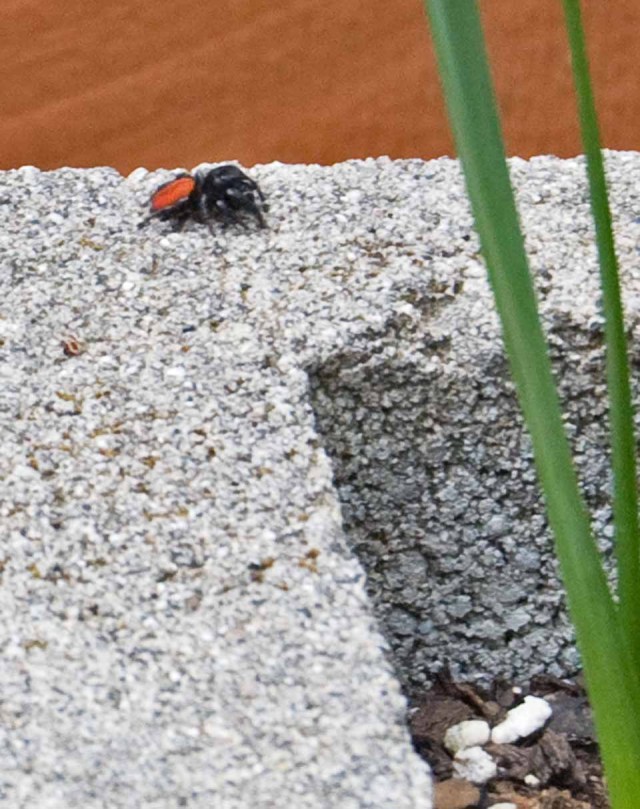 I’m still trying to rehabilitate my garden in time to plant veggie seeds for Earth Day on Sunday. While I was surveying the wreckage, I noticed this spider. When it noticed me, it jumped away. Cute little bugger!