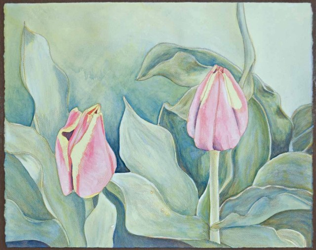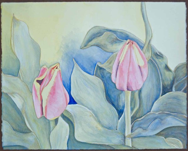 I have really dragged out this tulip watercolor painting. Here is my previous post on this project. During the last three and a half weeks (!) I added Cobalt Blue to the rest of the leaves, and began filling in the background and adding depth.