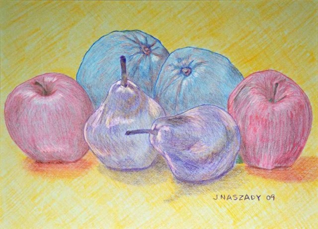 OK, today I’m back on the topic of pears, but I also have some mixed fruit to share. After I had drawn pears the traditional way, I decided to change-up the shades, and put my pears in the company of other odd-colored fruit. Here is my trio of purple pears, of which I am fond.