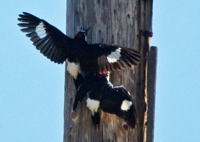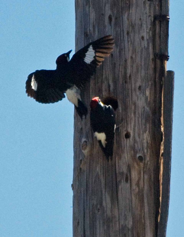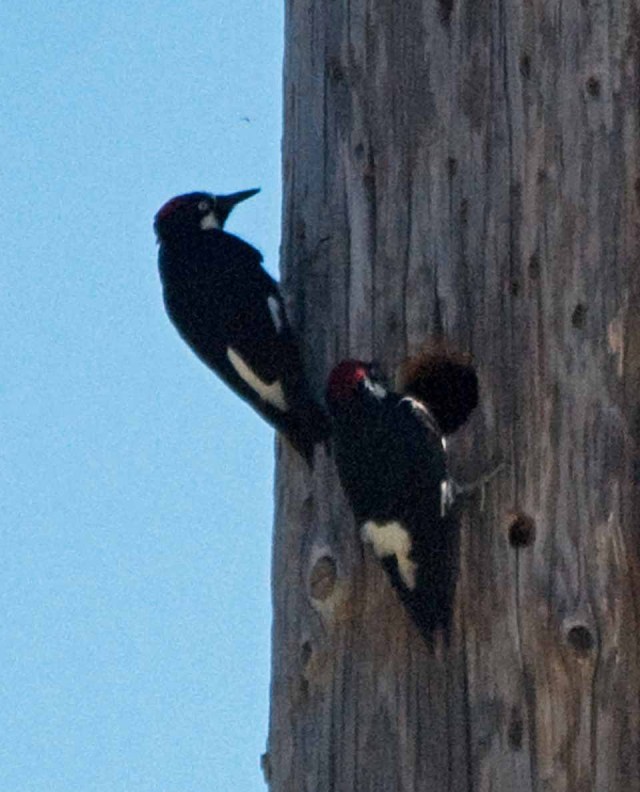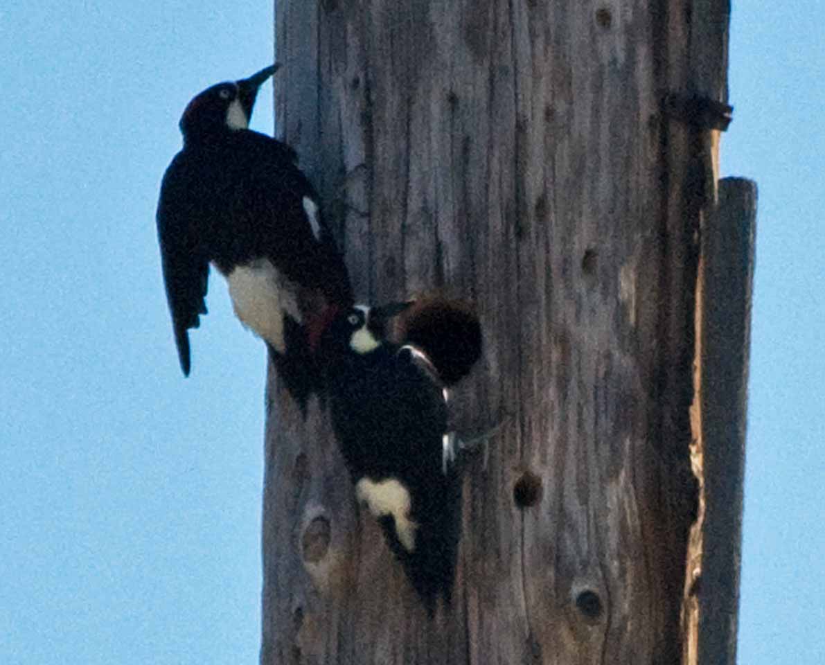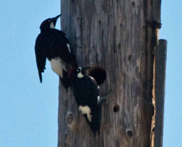 There are a variety of large trees, including pine and oak, all around my daughter’s house in Trinity County, California. But this pair of Acorn Woodpeckers seemed intent on setting up housekeeping in a nearby telephone pole. They were quite busy the last couple of days, flying back and forth, calling to each other, and hammering away at their project. I managed to catch them “on the porch” today.