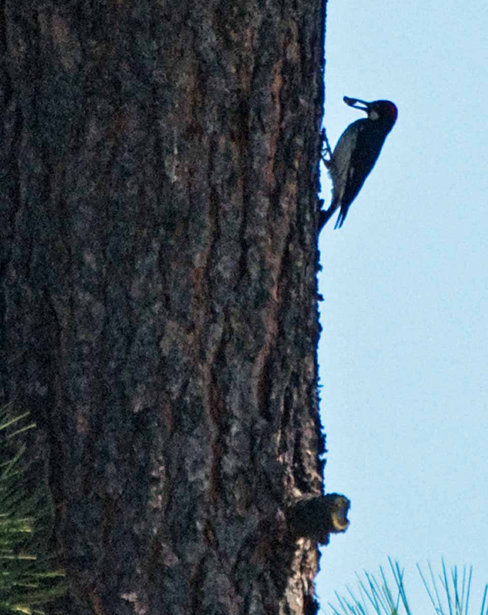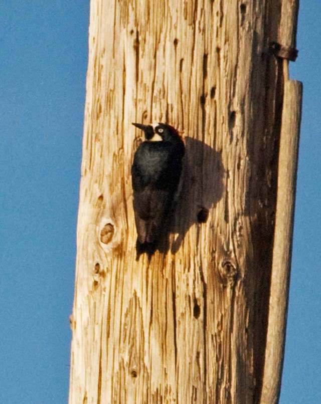 The pair of Acorn Woodpeckers that I have been observing near my daughter’s house are sharing a hollowed-out utility pole with a family of Starlings. They are a perfect example of getting along with the neighbors. You can hear the babies wailing from the pavement some distance away.
