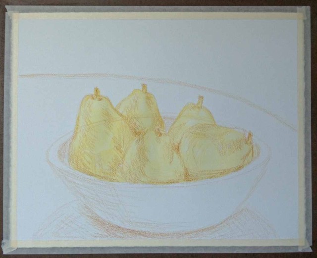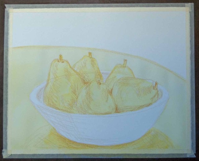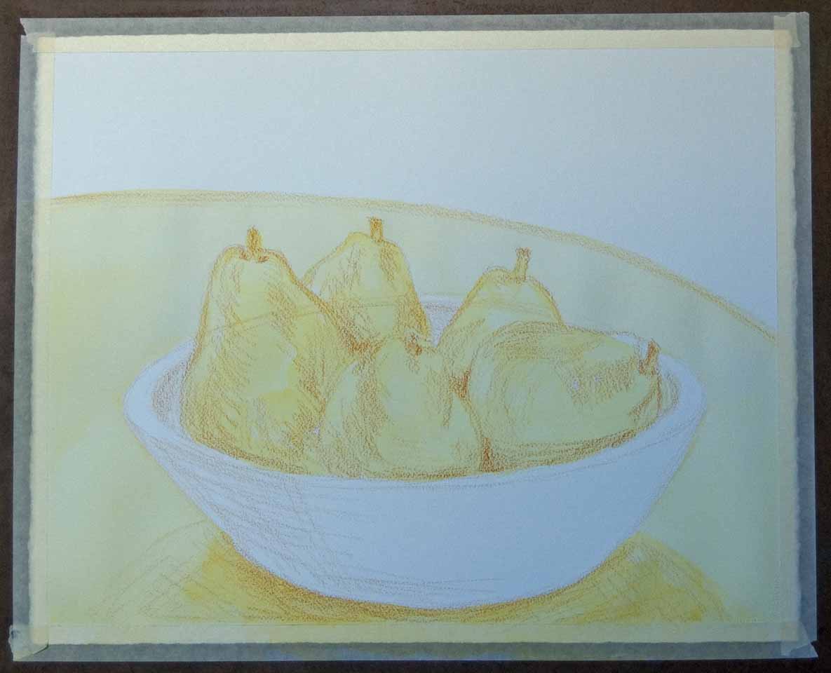 First I drew my arrangement with Goldenrod Prismacolor pencil. Then I painted the pears with a cool Cadmium Yellow Pale Hue.