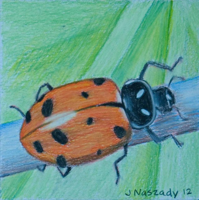 Today I used my new ladybug photo to create a 6×6 drawing with Prismacolor pencils. Now I’m thinking about using another medium for my ladybugs…