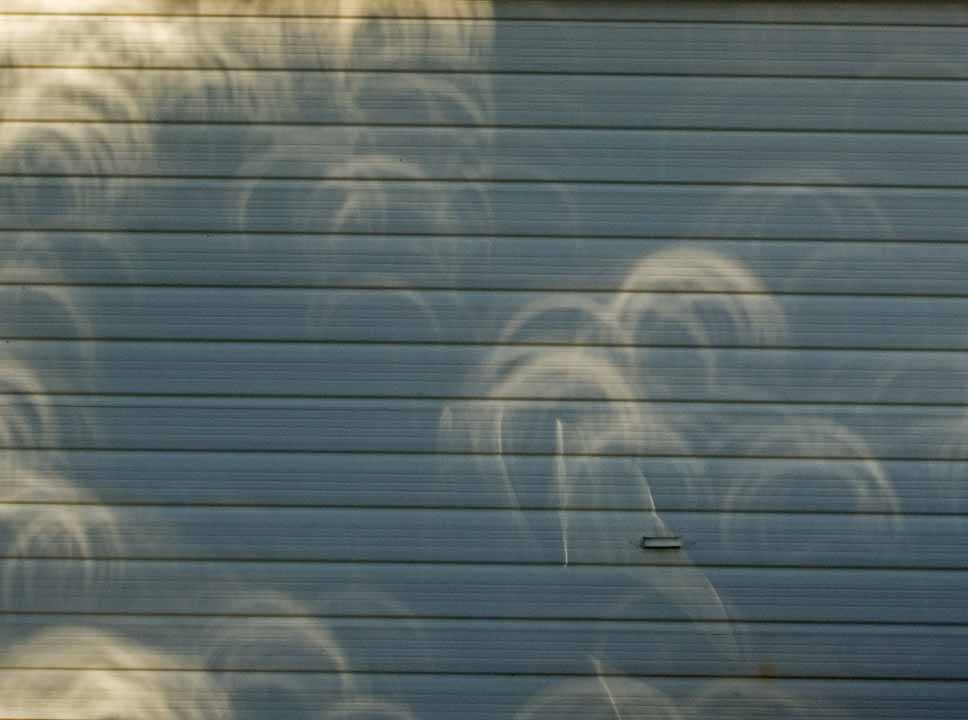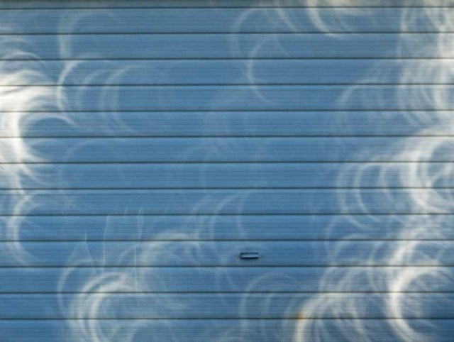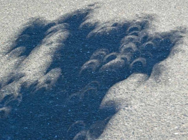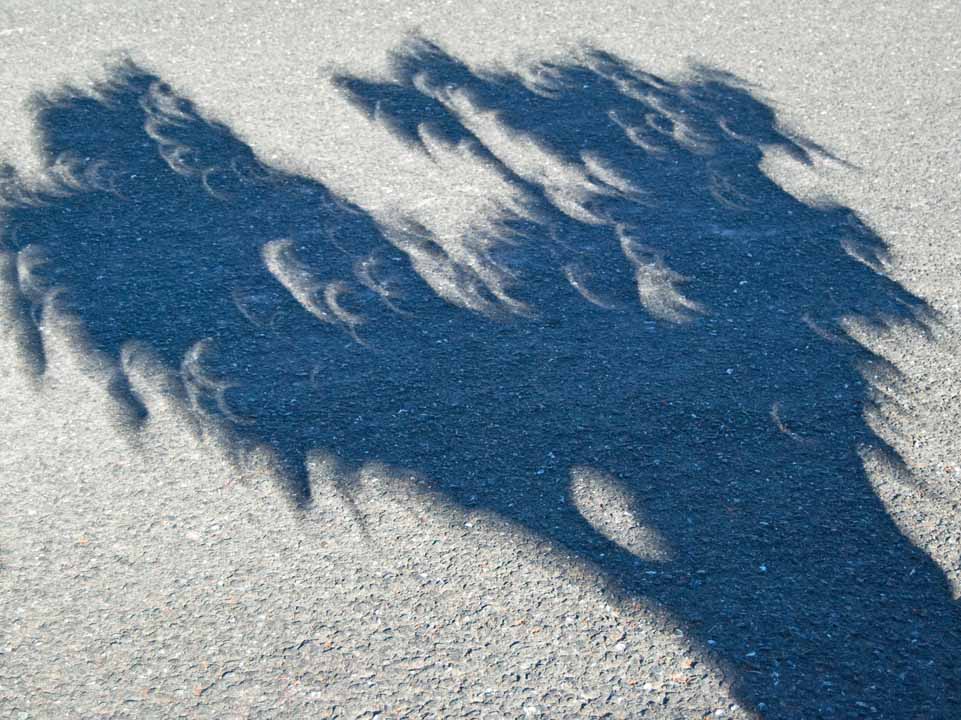 We live in northern California near the edge of the area where a complete eclipse was seen. I had a piece of paper with holes punched in it ready for viewing the shadow and watching the progress of the darkening sky, but this wasn’t very impressive. What really worked best was watching the reflection of the sunlight through the trees around our house on our neighbor’s garage and the street.