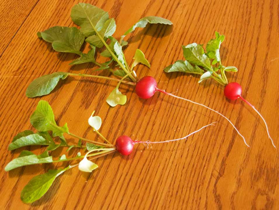 Here I am, just me and my radishes. Something in one of the wine half-barrels that I call a container garden is nibbling on the larger ones, so I have to harvest before they get too big. While I’m at it, I can’t resist photographing and drawing them.