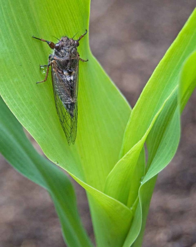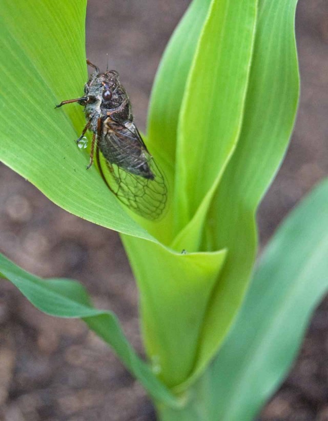 While I was working in my raised bed garden, I noticed this insect on one of the corn plants. I had to look it up, and learned quite a bit on the Wikipedia site about cicadas.