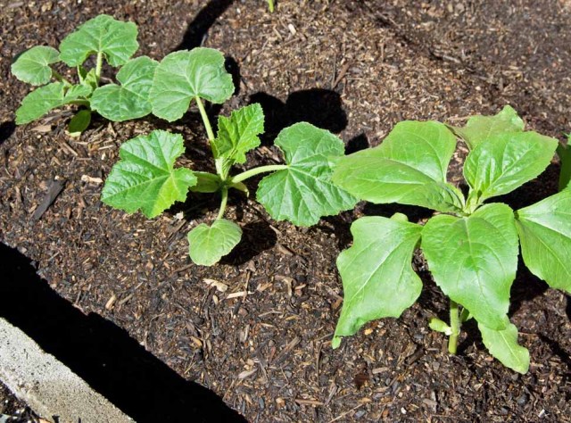 One of these squash plants is not like the others. Sound familiar? Like a well-known Sesame Street song? I thought I heard you humming that tune…It is painfully obvious that, although they all came from the same summer squash (yellow crookneck) packet, the leaves on the tallest plant are decidedly different from the other two on this rather crowded hill. The seed leaves looked similar, but then everything changed.