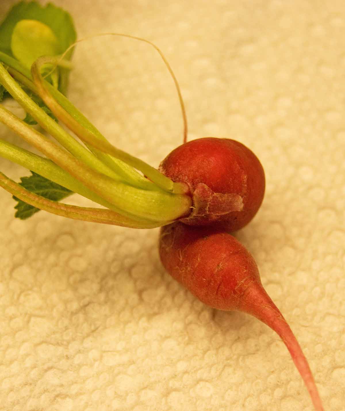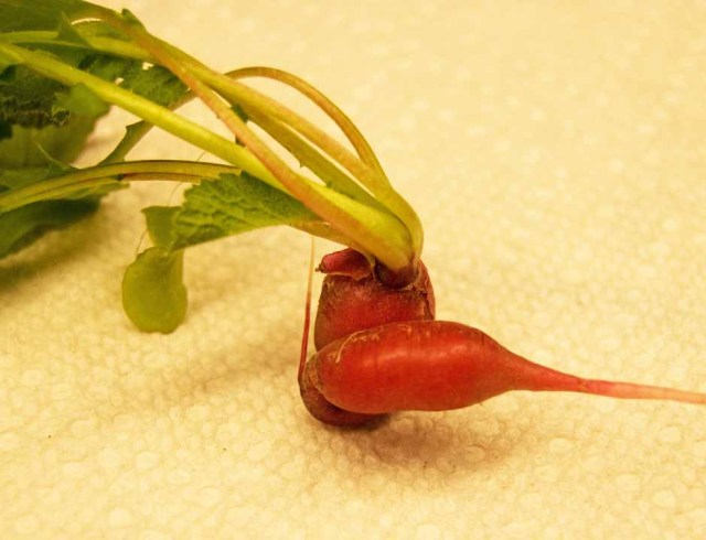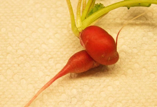 Then I pulled up a very odd one. It was twisted around like a corkscrew. This little veggie got confused or crowded or something. If not for gravity, it might have grown back up. Here are some poses that tell the tale of radish gymnastics.