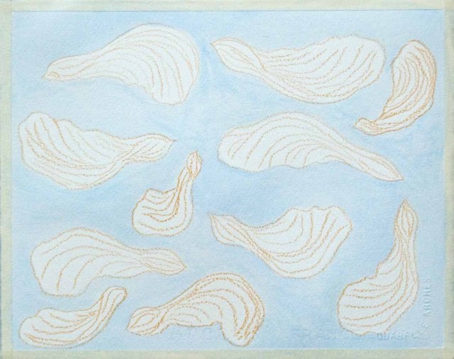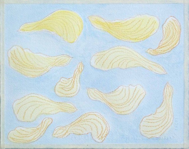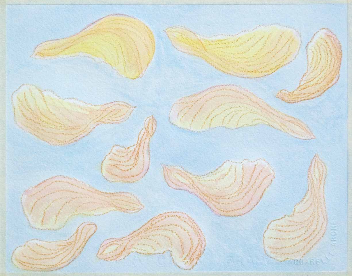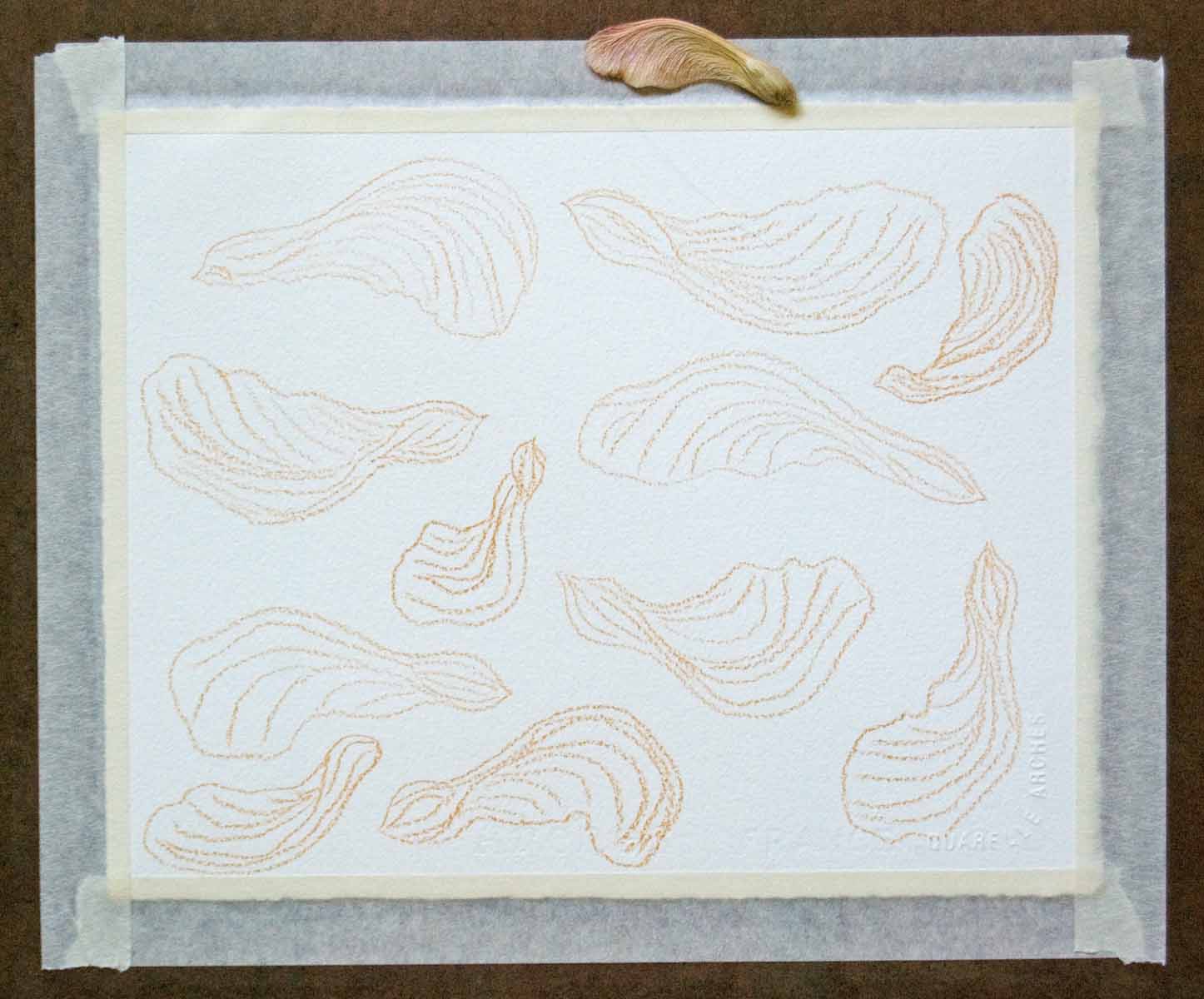 They’re still hanging around, lining the depression below the downspout from the roof, frayed edges poking out of the soil here and there, little piles scattered on the unswept patio. Tsk,tsk! I have a collection in a shallow dish. I drew them. I photographed them in a swirl.
