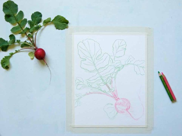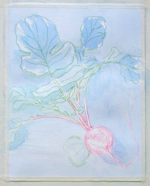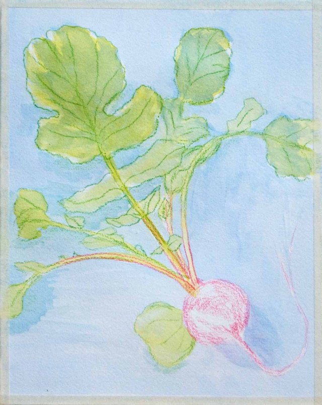 It has been almost a month since I first began drawing the radishes harvested from my garden. They are so appealing to draw-so bright and cheerful! But I realized that I might be in over my head starting out with a larger painting. I decided to take a step back and work on something smaller first.