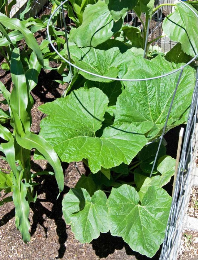I probably need to fertilize, but I planted more seeds. Things seem to be going well since the weather warmed up again. I put tomato cages on my squash plants (and my tomato plants as well), something that I saw online last year. You train them up, and it saves space in a crowded garden (like mine). It also helps to keep the leaves dry (since squash leaves tend to mildew).
