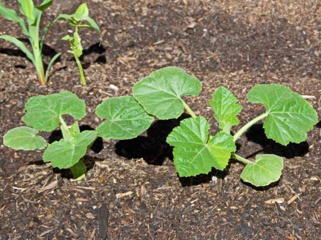 Here are the squash plants in my raised bed after thinning, in early June.