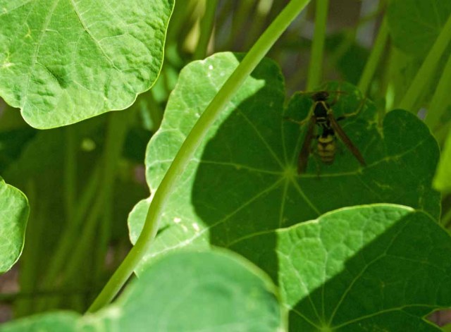 This yellowjacket hangs around my raised bed garden, the only place where I have seen the squash bugs. I was hoping it would control some of the nibblers. I guess there would be even more holes in the leaves if it weren’t around.