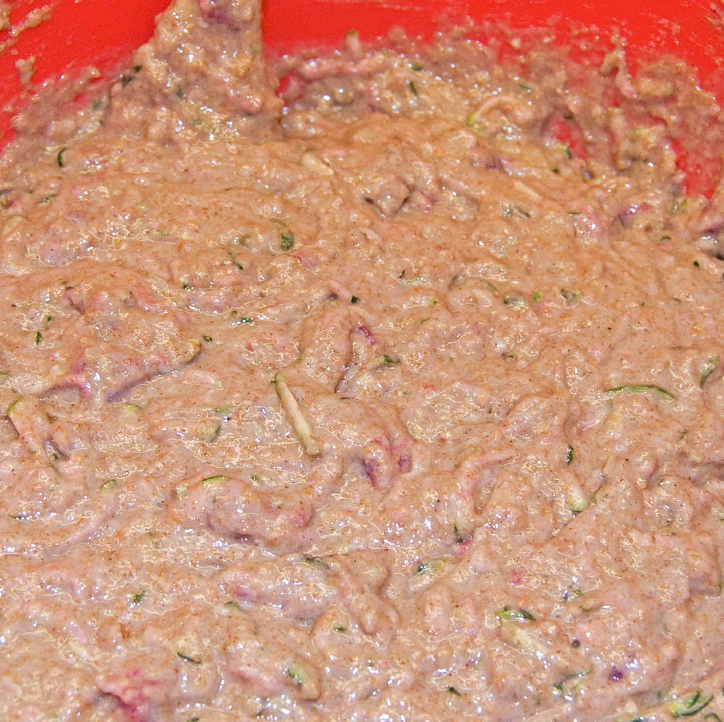 Mix 2 grated zucchinis (1 1/2 cups packed), 4 large mashed plums (1 1/2 cups), 1 cup vegetable oil, the juice of 1 large lemon (1/4 cup-I used the juice left from the grated lemon zest in my last recipe), 2 whole beaten eggs, 2 beaten egg whites, 1/2 teaspoon cinnamon, 1/2 teaspoon allspice, and 1/2 teaspoon ginger.