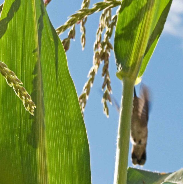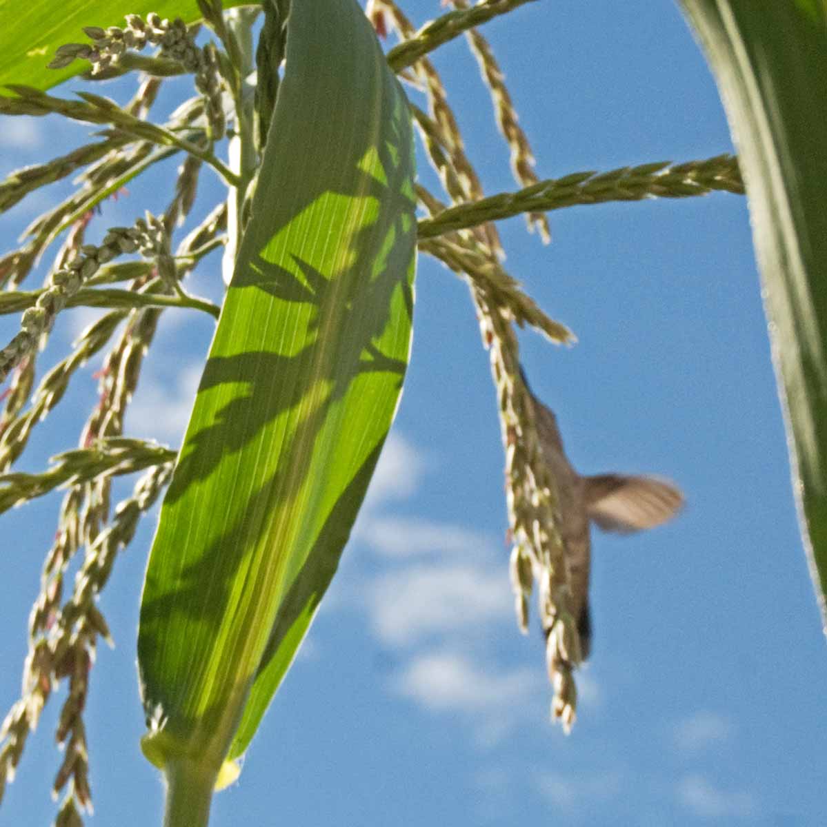 I was taking a photo of the corn in my mini garden, and look what appeared! I caught this hummingbird on the fly with my wide-angle lens.