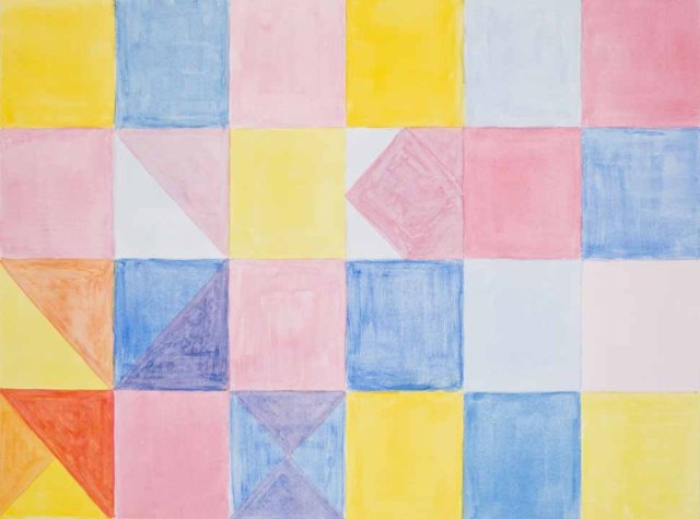 I drew a grid of 24 rectangles with pencil on Arches hot press watercolor paper. Then I painted in the rectangles with primary colors. I used Cobalt Blue, Ultramarine, Cadmium Yellow and Cadmium Yellow Pale Hue, and Alizarin Crimson. I did not use a set pattern, but there is already some repetition besides the rectangular tiles.