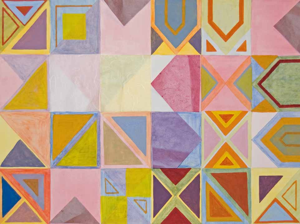 I painted rectangular tiles with watercolor, and then added triangles by layering color.