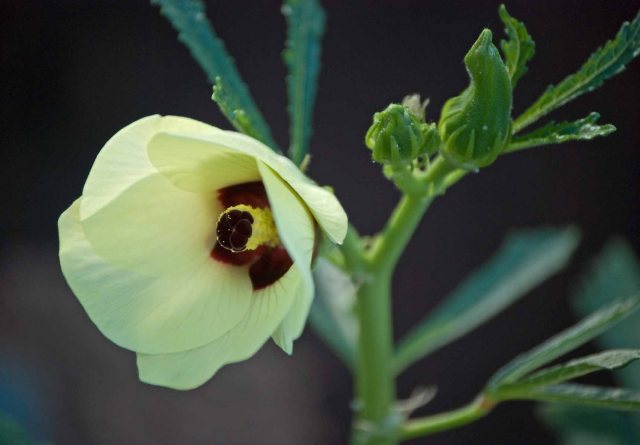 While watering in the garden I share with my landlady, I was startled by an unfamiliar flower. I had noticed the seed pods on the plant, and thought it was okra, but I had to check. Sure enough, I was right! What a beautiful bloom.