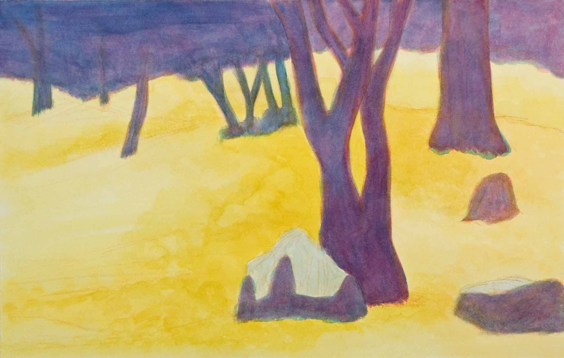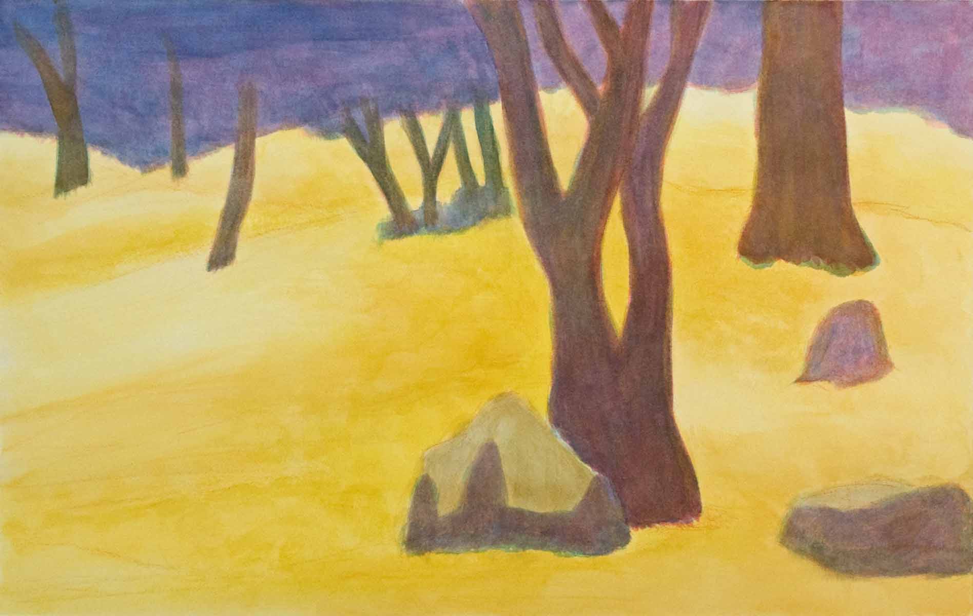 I began by sketching the scene with my favorite Prismacolor pencil, Goldenrod. Then I put down a minimal layer of Cadmium Yellow Pale mixed with Yellow Ochre.