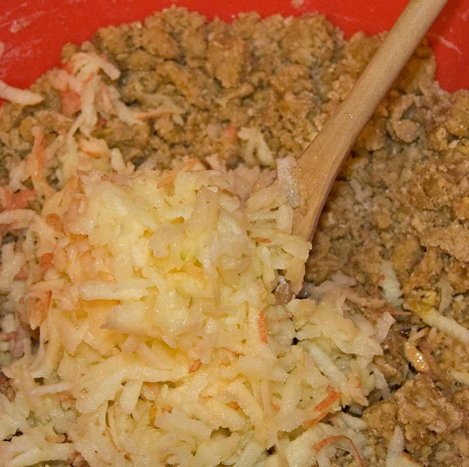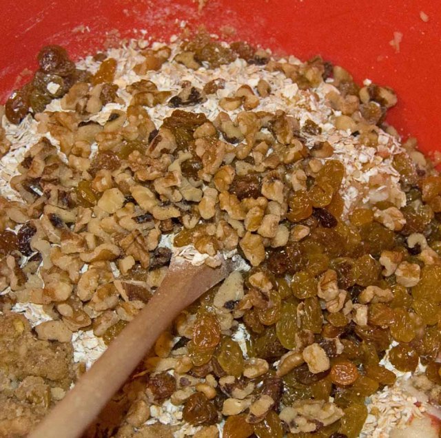 Blend in 1 grated apple (1 cup), 1 cup milk, 2 cups oatmeal, 1 cup golden raisins, and 2/3 cup chopped walnuts.