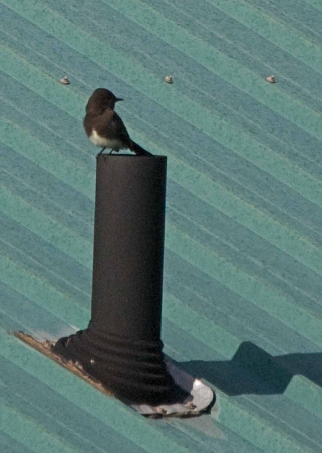 No, it’s not an early visit from Santa. It’s a Black Phoebe, hanging out on the neighbor’s roof, looking for a meal after the last storm.