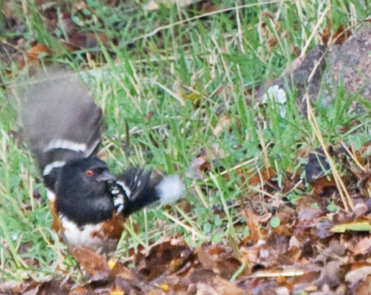 I followed this Rufous-sided Towhee around the yard, taking pictures of other birds as it eluded me. At long last it came out of the bush where it had taken refuge with its pals, and I got this shot of it in motion. I have never known this bird to stay still for long.