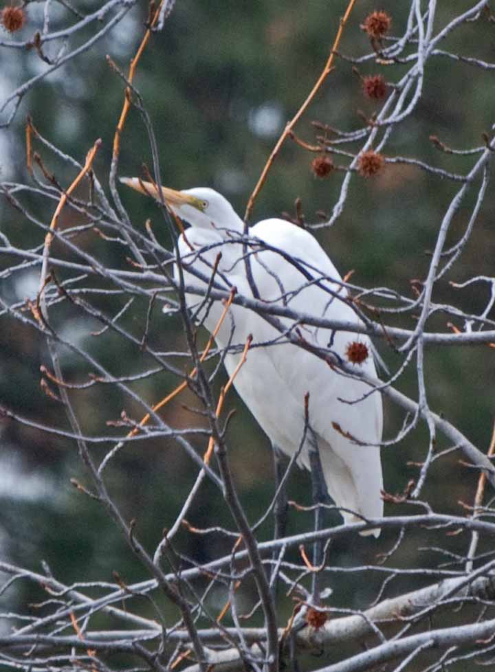 A trip to a local pond for a walk included a visit from a Great Egret, often seen perched in a tree along the shore. Another series of storms is headed our way, and I will be perched for quick trips outside in between to catalog more harbingers of Spring.