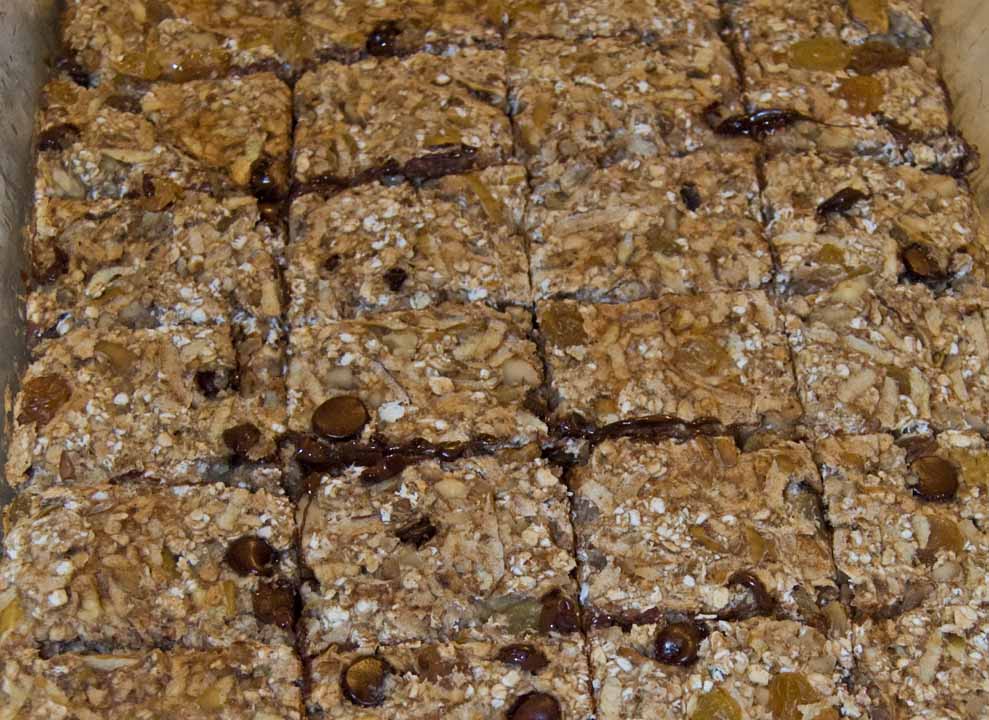 This one has no eggs, no added sugar or salt, and no added fat. The sweetness comes from fresh fruit (apples), cinnamon, and a bit of sugar in the minuscule amount of semi-sweet chocolate chips. Also, there are golden raisins. The fat comes from chopped walnuts, and a bit of vegetable oil added to the glass baking dish. They are chewy and flavorful, not too gooey and not too dry. Here is my recipe: