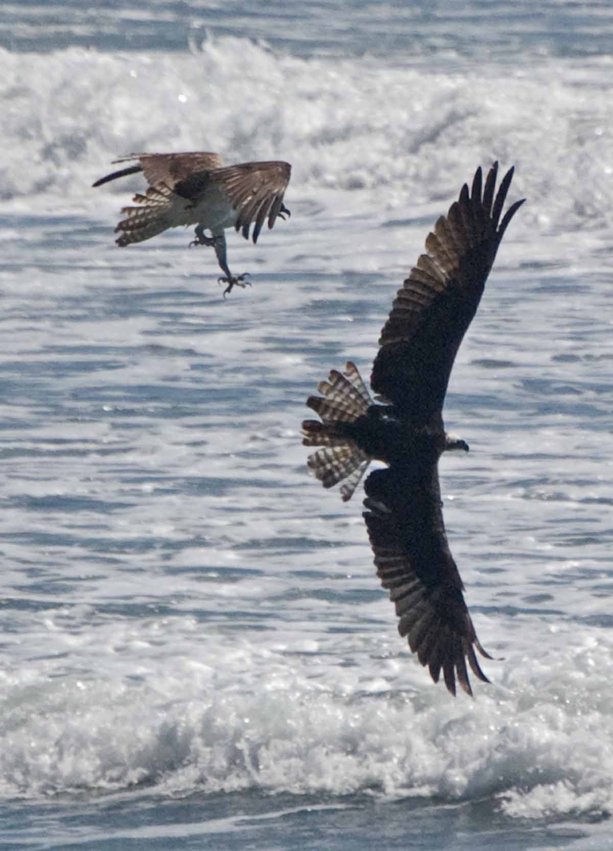 An Osprey passed us as it cruised along the cliffs. The vertical drop was considerable, but the trail was long enough so that the descent was gentle. We were rewarded upon reaching the shore with the sight of a pair of Osprey fishing in the surf.